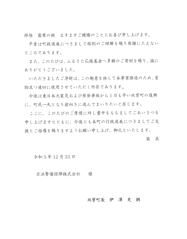 大きかった 福島県大熊町、富岡町、浪江町、楢葉町、双葉町 (五十音順)への「ふるさと納税」による寄附をいたしました。
