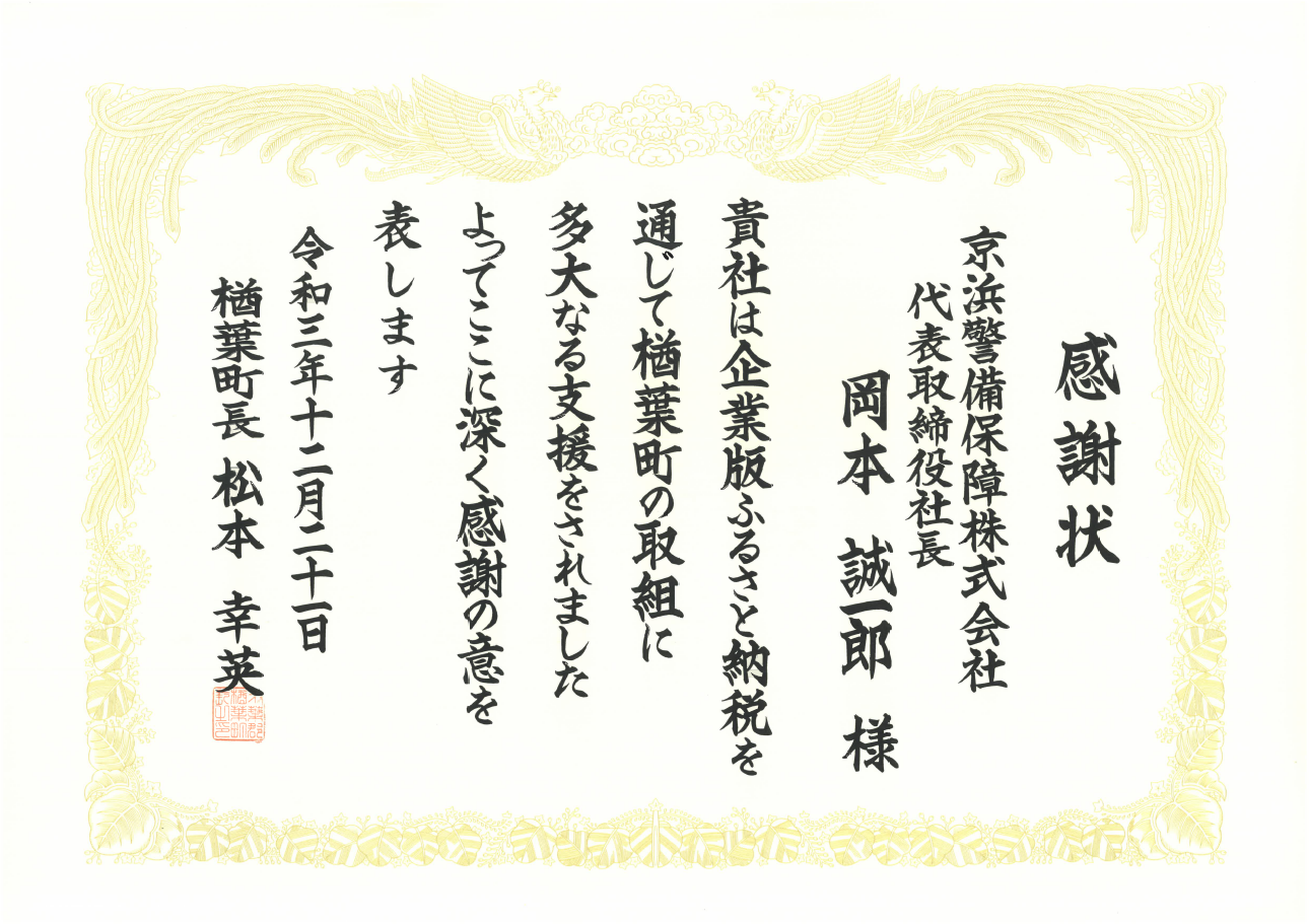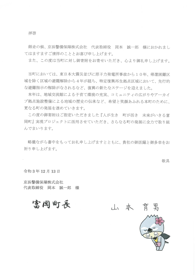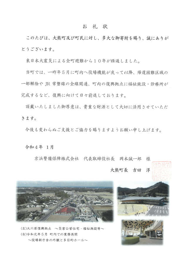 それぞれの町より、お礼状・感謝状をいただきましたのでご披露いたします。